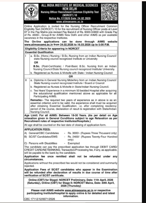 All India Institute of Medical Sciences (AIIMS), New Delhi, has announced the 10th Phase recruitment for Nursing Officer (NORCET) with over 3000+ vacancies. Interested candidates can apply online from 24 February to 16 March 2026. The age limit for applicants is 18 to 30 years as on 16 March 2026. Candidates must meet the eligibility criteria and check the official notification before applying for this AIIMS NORCET 2026 Nursing Officer recruitment.